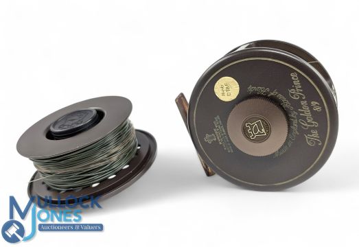 Hardy Bros "The Golden Prince" 8/9 alloy trout fly reel with one spare spool, ventilated spool, 2 screw latch and brown handle, large rear spindle tensioner, constant check, ‘U' shaped alloy line guide. Reel in block leather case, spool in MZC. Both with very light use and run well. (2)