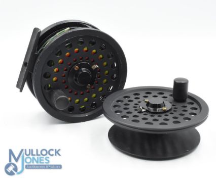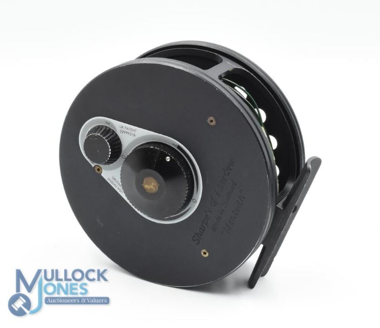 Sharpes of Aberdeen ‘Menteith' 3 5/8" alloy fly reel and spool (2) in black finish, with UK and USA Patent twin drag to rear, R or L hand use, constant check, in good condition