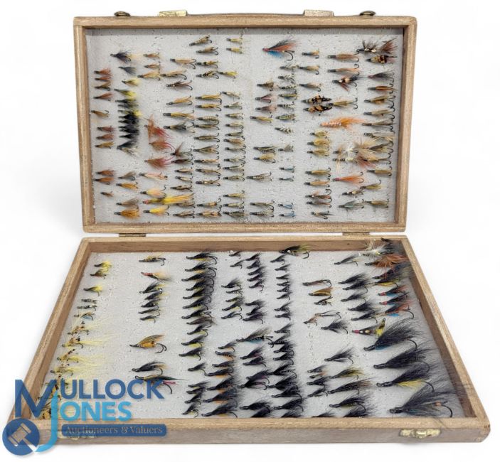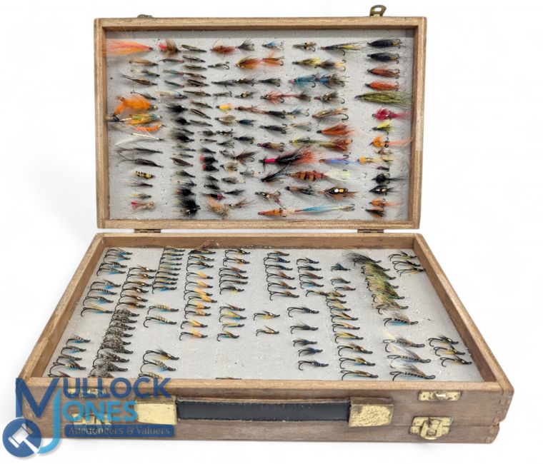 Wooden Salmon Fishing double sided Fly Box full of salmon flies, singles and doubles, with Jungle Cock and Golden Pheasant examples inside (100s)