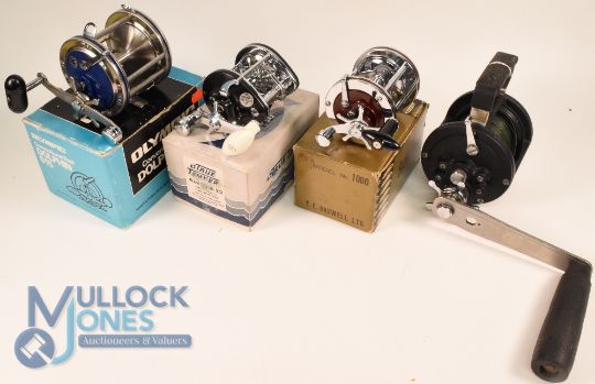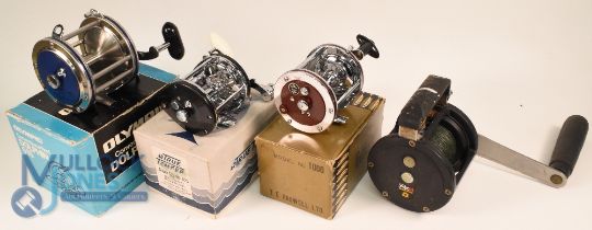 4x Sea fishing multiplier reels, Daiwa Sealine 610 rock cod special with factory oversize power crank and handle, free spool, ratchet check, lifting bar, a Gilfin model 1000, 3/0 size, star drag, free spool, level wind, little used, complete with papers in MOB, a True Temper Ocean City 923, star drag, free spool, ratchet, level wind, as new with box and papers and an Olympic, Japan Dolphin 615, 4/0 size, free spool, star drag, on/off ratchet check, appears unused, in MOB. (4)