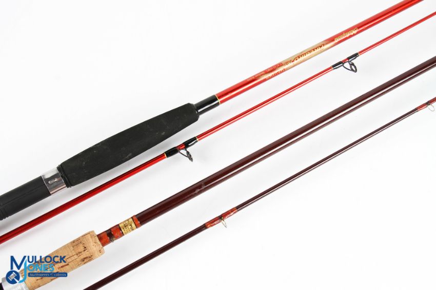 Shakespeare Firebird SAP 1155450 carbon spinning rod, medium action, 7' 2pc 22" handle with uplocking reel seat, lined guides throughout, cloth bag, light use; unnamed hollow glass spinning rod 10' 2pc 16" handle with alloy uplocking reel seat, line stripping rings, cloth bag (2)