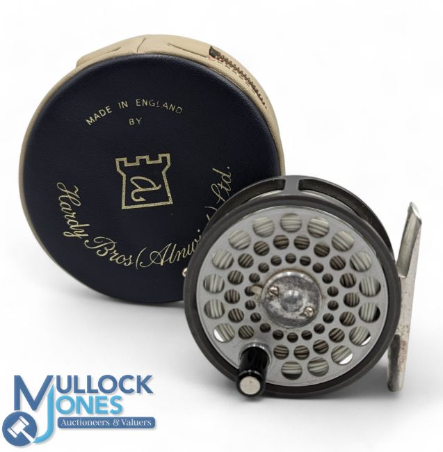 Hardy Bros "The Fly Weight" alloy trout fly reel 2 ½" ventilated spool, 2 screw latch, black handle, constant check, alloy ‘U' shaped line guide and foot. MZC, very light use