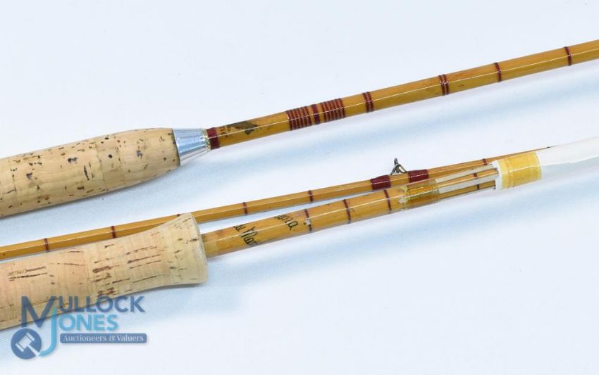 J S Sharpe Aberdeen Scottie Brand split cane trout fly rod No 2651, 9ft 2pc alloy sliding reel fittings and collar, red agate butt ring, cloth bag, looks re-varnished. Hardy "The Pope" Palakona trout fly rod, 10ft 2pc line 7# - note restoration in progress - unoriginal reel seat, no rings, repair to butt section (?), no ferrule, MCB (2)