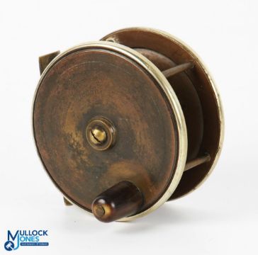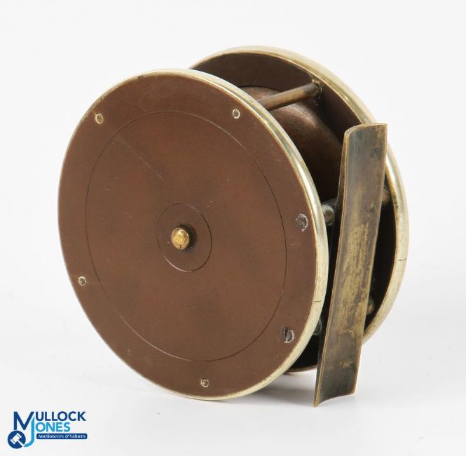J Gillett Maker, 40 Fetter Lane, London, brass and ebonite fly reel, 3.75" wide spool, oversize domed handle, 1.5in crack to ebonite back plate, 6 pillar frame, German silver rims, very original, runs very well