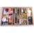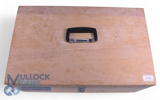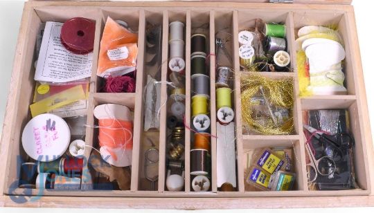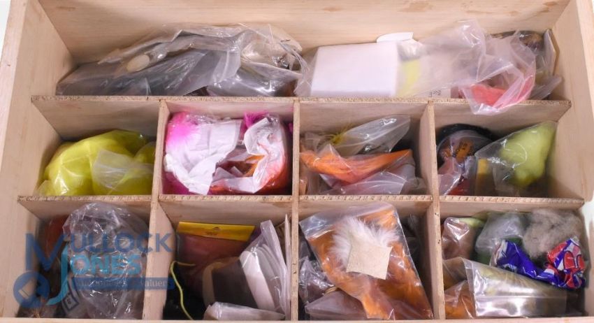 An assortment of fly tying materials including silks, feathers, wool, packets of dyed materials, a few assorted tools, all held in a custom wood cabinet measuring 21" x 13" x 10", with carry handle and latch.