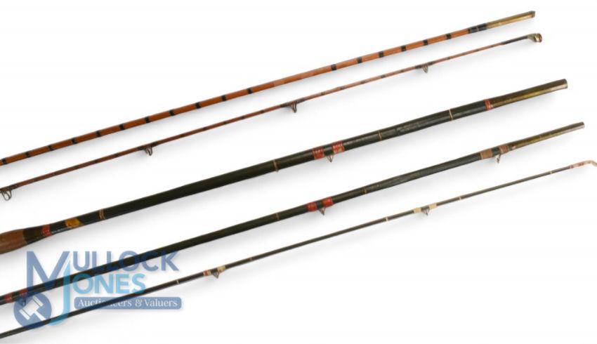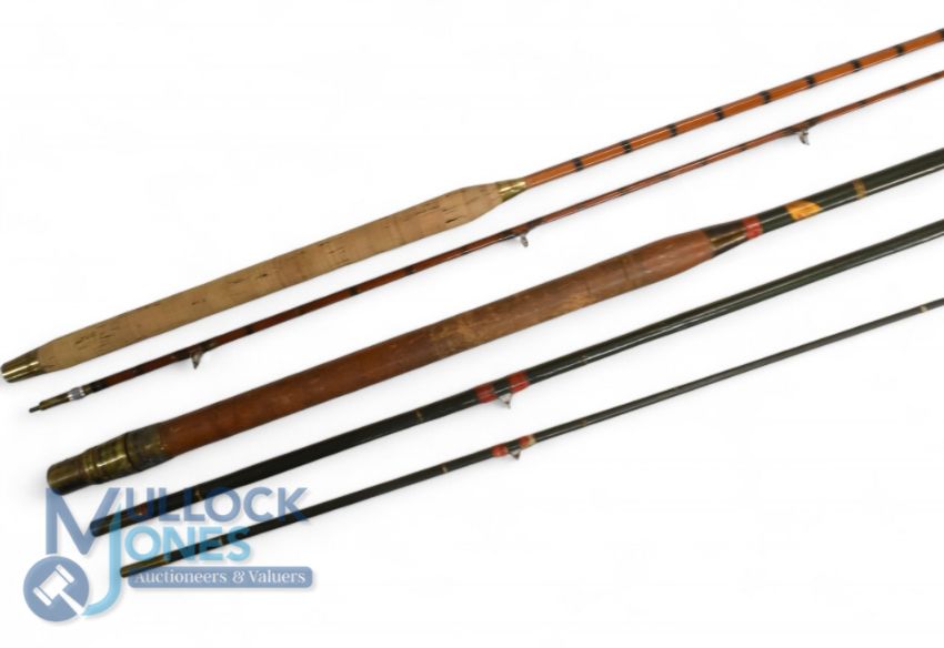 Allcocks "The Viking" glass coarse rod - 9ft 3pc, 19" handle with brass sliding fittings and collar (mid section 4" short), cloth bag. Interesting Farlows split cane trout fly rod - 7ft 6" 2pc (missing butt ring), brass collars (no siding reel fittings), oversize red agate tip ring and patent screw lock joint. Cloth bag, wrong size. (2)