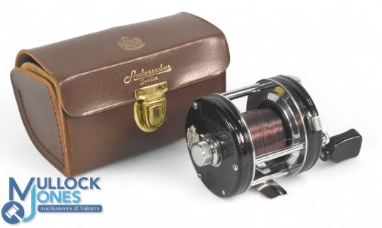 Abu Ambassadeur 5000C multiplier reel fine condition, twin black handles, 3 screw grooved end plate, foot stamp 087100, c/w spanner, oiler in fitted leather case