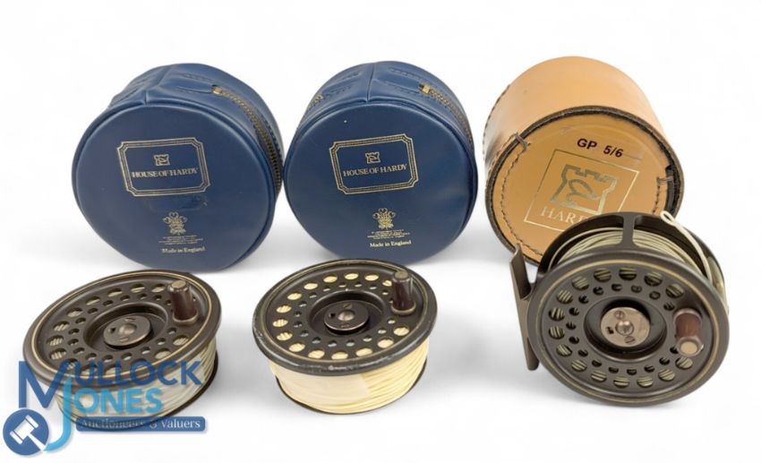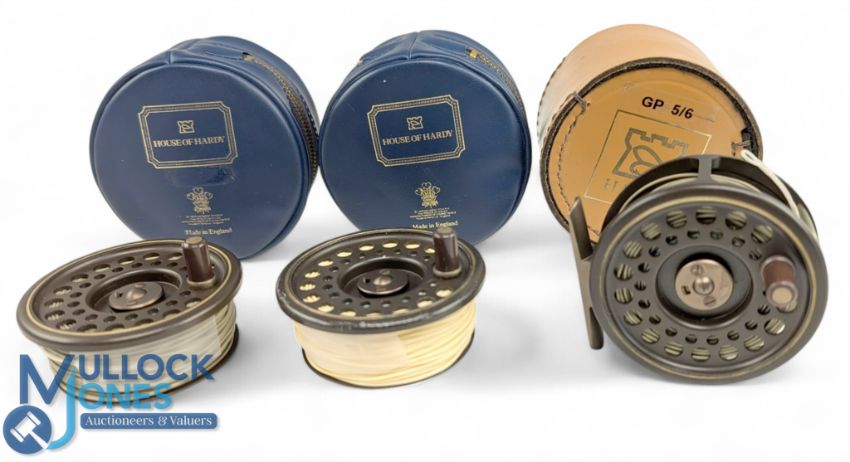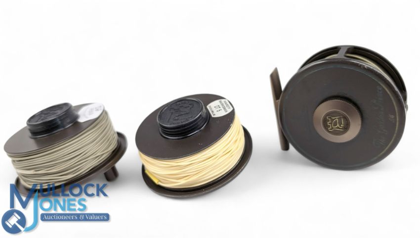 Hardy Bros "The Golden Prince" alloy trout fly reel 5/6 with 2 spare spools, ventilated spool, 2 screw latch and brown handle, large rear spindle tensioner, constant check, ‘U' shaped alloy line guide, reel in black leather case, 2 spools in MZC. Reel has very light use and spools with cog covers