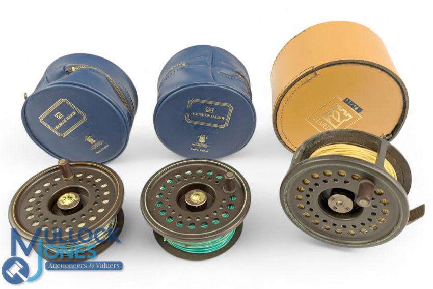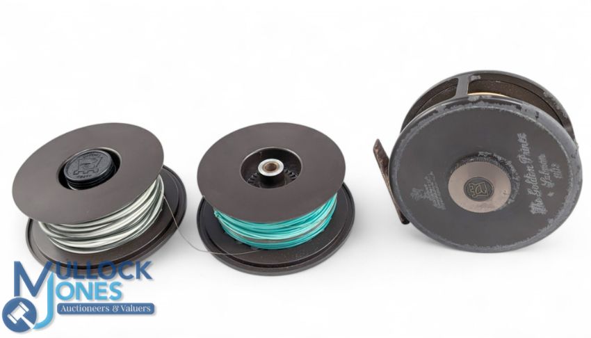 Hardy Bros "The Golden Prince" 11/12 alloy salmon fly reel with spare spool, ventilated wide spool with 2 screw latch and brown handle, large rear spindle tensioner, constant check, ‘U' shaped alloy line guide, ribbed brass foot. Reel in block leather case, spool in MZC. Reel shows signs of rim wear but runs very well