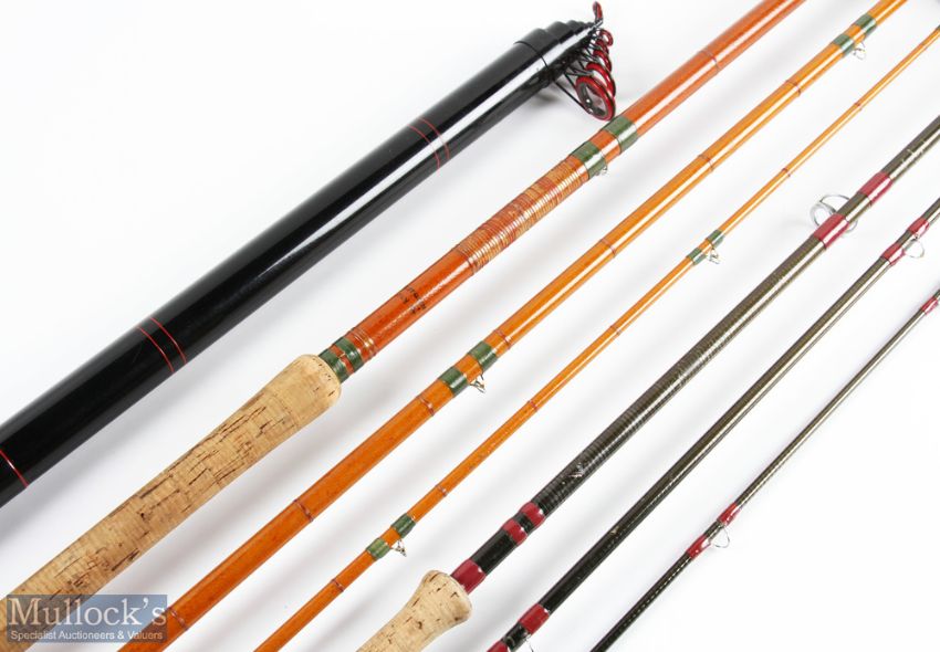 Shakespeare O-Series graphite glass 1303-520 telescopic rod 5.20m 6pc, alloy double uplocking reel seat, leather wrapped handle, plastic bag; unnamed carbon salmon fly rod 13' 2pc 24" handle with alloy sliding reel fitting, lined butt/tip rings, cloth bag; "The Autumn" hollow glass salmon fly rod 14' 3pc 30" handle with alloy sliding reel seat, red agate butt/tip rings, cloth bag (3)