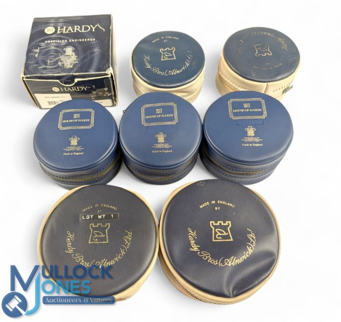 Hardy Bro Fishing Reel Cases, a selection of smaller reel cases, plus an empty Marksman spool box, good used condition (8)