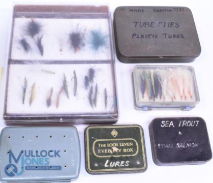 A collection of containers with sea trout and salmon flies: Tin of tube flies. Unnamed black japanned box 4" x 3" with 3 hinged clear view windows with small salmon flies. Double sided case with streamer. Large plastic box with 17 flies. Loch Leven eyed fly box, 40 clips to base. Alloy box with 60 clips and a quantity of large salmon flies. (6)