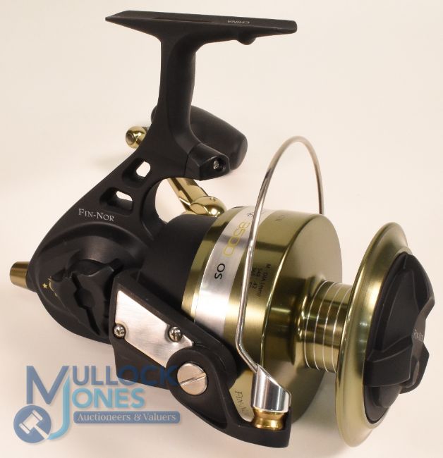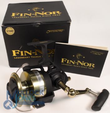 Fin Nor 9500 Offshore spinning reel, in as new condition, stainless steel drive gear, pinion and shaft, 4x double shielded stainless steel bearings, multi-layer saltwater protection, capacity, Mono 600 yards of 20lb, braid, 475 yards of 65lb, complete with handbook, reel bag and maker's box