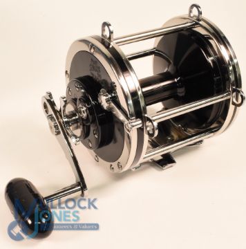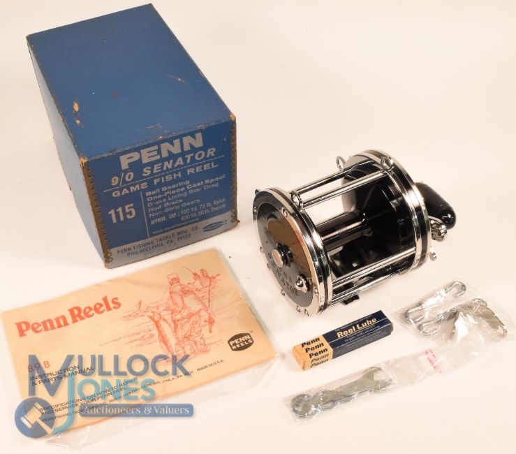 Penn Senator 9/0 Big Game fishing reel, model 115, made in USA, 4.6" diameter, star drag, free spool, ratchet on/off check, appears unused, complete with rod saddle clamp, spanners, oiler, handbooks, in maker's original box