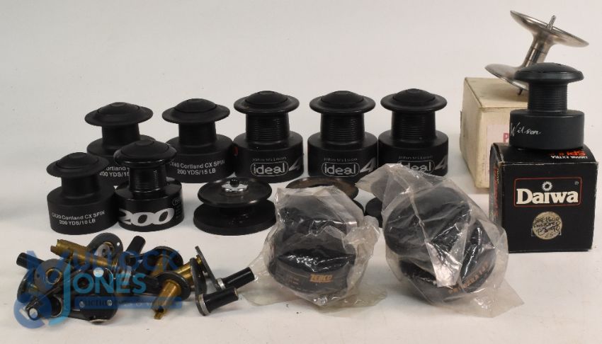 Collection of spare spools, as listed: Penn No 29M-60 for 60, 85, 111, 285 reels. Daiwa Float Wilson; 4x John Wilson Masterline 400 x 3, 200 x1. 3x Cortland CX40 x2, CX20 x1. 2x Zebco 142 and 132. 3x unknown spools. 10x handles - not for forks! (24)