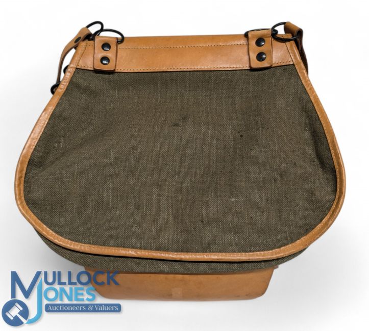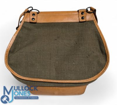 canvas and leather, Wicker Fishing /Game Bag, Olive green canvas leather edged bag with one internal large pocket with centre divider having wicker creel at front complete with straps signs of light use