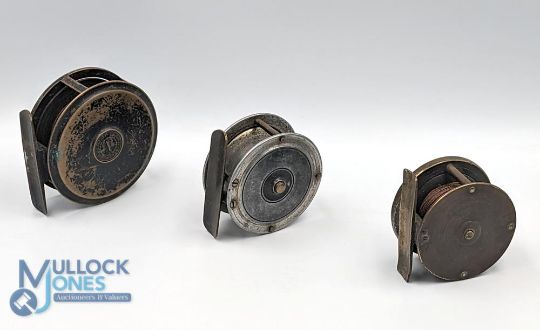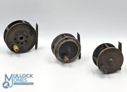 Moscrop of Manchester 3" brass Patent fly reel, faceplate brake adjuster, horn handle, tight to wind, a Carter and Son Majer's London 2 ¼" all brass fly reel, lacking check and a 2 ½" alloy/brass Hercules pattern reel, horn handle, fixed check, retains some fishing. (3)