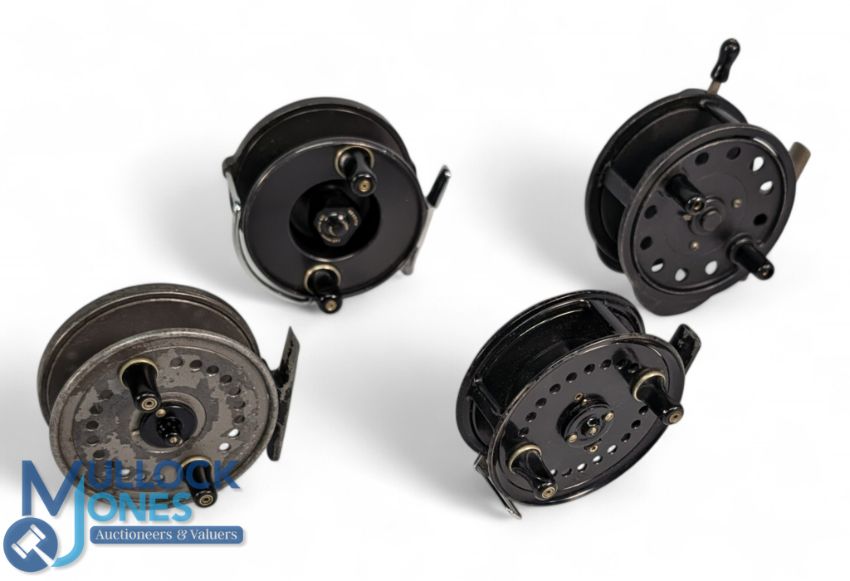 J W Young & Sons / Allcock / Milwards Fishing Reels "The Windex" centre pin alloy reel, RHW, 4" wide spool with twin shaped handles, large centre tensioner, on/off check, alloy line guide and foot, light wear, runs very well, "The Seldex" alloy reel 3 1/2" spool with twin handles and 2 screw latch, on/off check, Milward Gyrex 4" alloy Silex type casting reel, rim brake and over run controls, Allcocks No 3 Easicast spinning reel for salmon/pike etc 3 1/2" wide ventilated spool with 2 screw latch, twin tapered handles, milled tensioner, line guide regulator, on/off check (4)