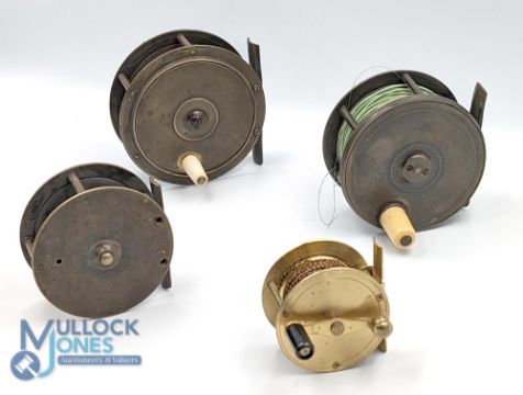 DAM Germany Effzeitt 495 brass 2 1/4" winch counter balanced handle, on/off check, runs well. Birmingham style 3 1/2" brass unnamed reel, ivorine domed handle, runs well. Unnamed Hercules style brass 3 3/4" reel, tapered handle, on/off check not working. Unnamed 3" brass reel, no handle, missing screws. Parts only. (4)