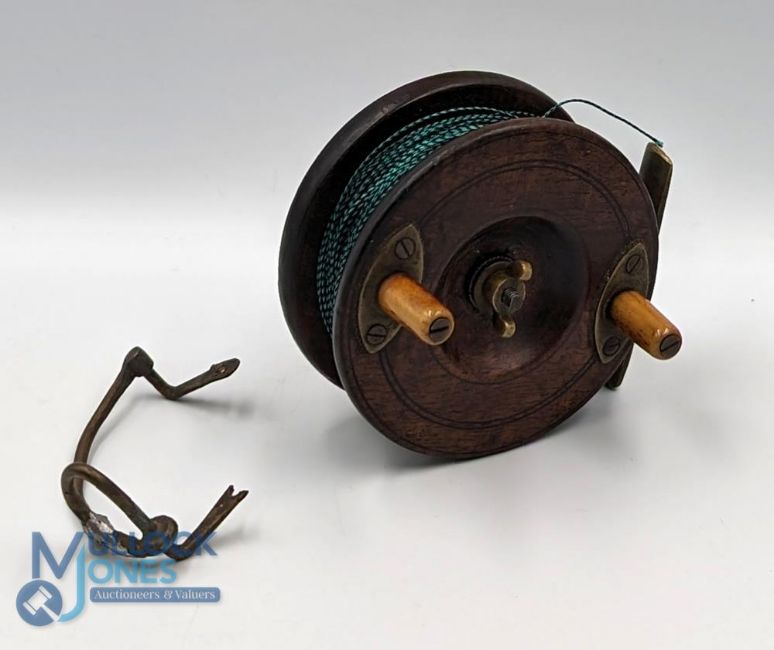 A scarce cone brass and mahogany star back reel, 3 3/8" spool, twin horn handles on brass mounts. Note on/off check not working and line guide detached and repaired. Good project