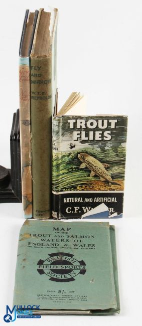 4x Period Fishing Books, to include Map of the Trout and Salmon Waters of England and Wales 1958 ed, Trout Flies C F Walker 1965, Fly and Minnow W F R Reynolds 1930, Going Fishing Negley Farson 1943 - reprint