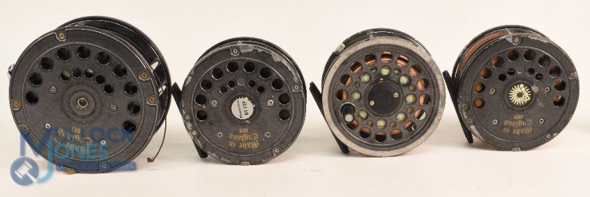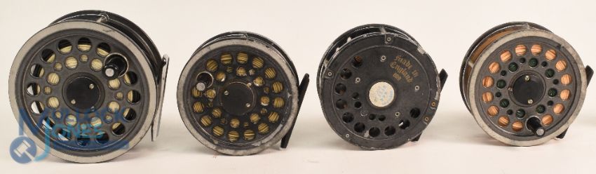 Collection of 4 Daiwa salmon fly reels by J W Young, in sizes 3 1/2"-4 1/4" diameters, rim tension adjusters, check clicks, with variety of fly lines including Cortland & Masterline. (4)