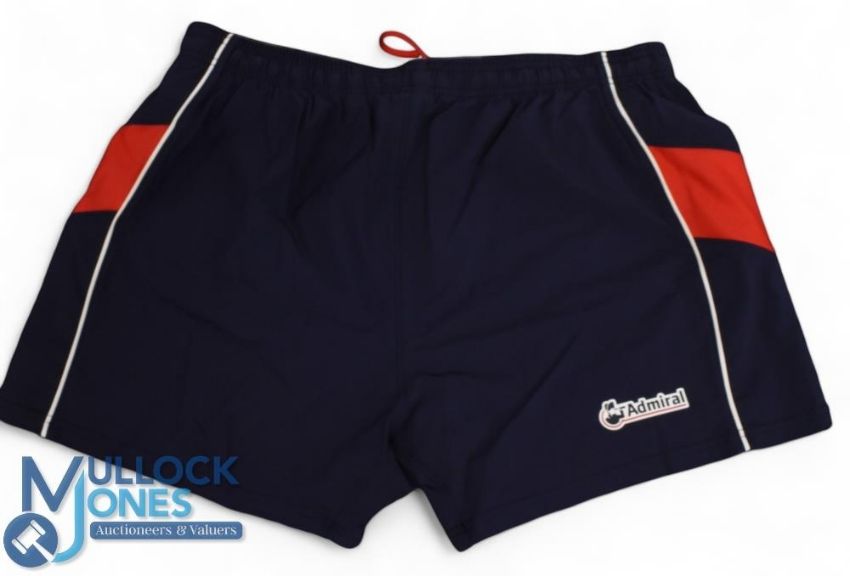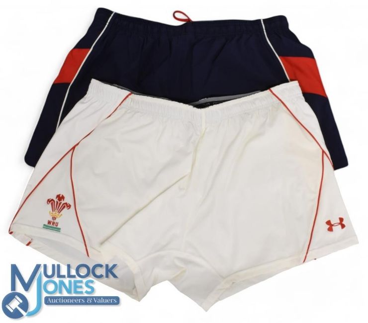 2000s Trio of different Wales Rugby Shorts (3): Mint threesome of very large hookers' and others' shorts, fully logoed: with WRU, makers Under Armour & sponsors Admiral, and in one case bearing the no.2. White, black and navy examples. Great!