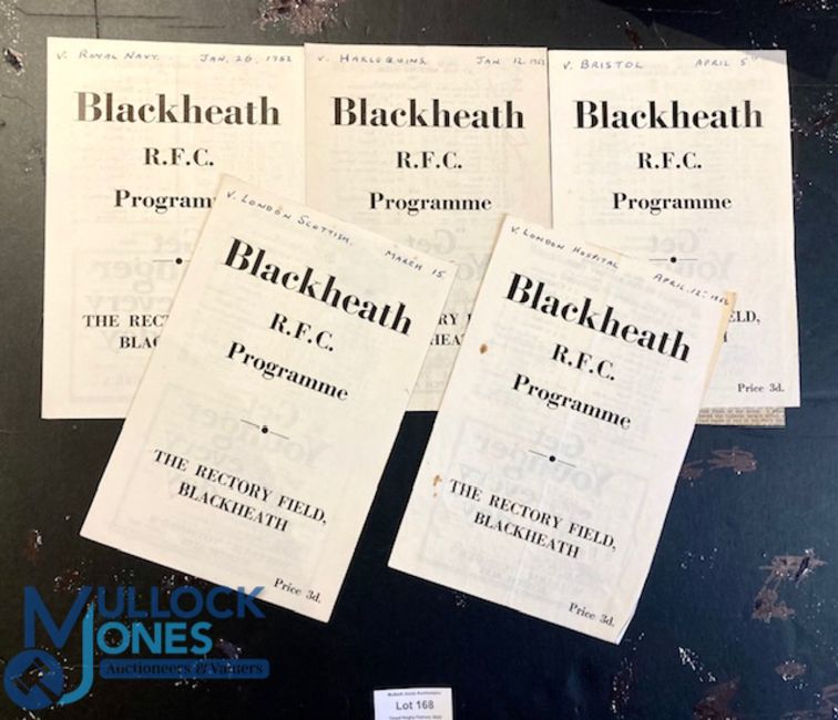1952 Blackheath Rugby Programmes (5): Homes v Royal Navy, Harlequins, L Scottish, Bristol & London Hospital. VG, some with cuttings
