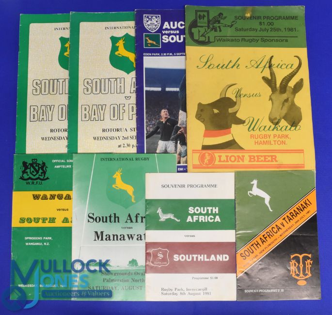 1981 S Africa in NZ Rugby Programmes (8): v Waikato, Taranaki, Manawatu, Wanganui, Southland, Bay of Plenty (2) & Auckland. G/VG