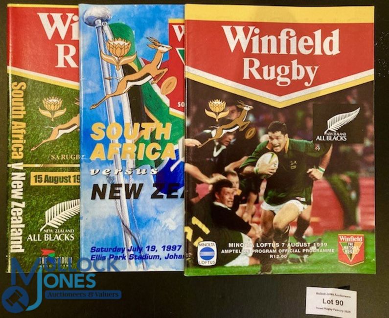 1997-99 New Zealand in S Africa Test Rugby Programmes (3): Thick neat A5 colour issues from the Tri Nations games of three consecutive years, at Jo'burg, Durban & Pretoria. Excellent