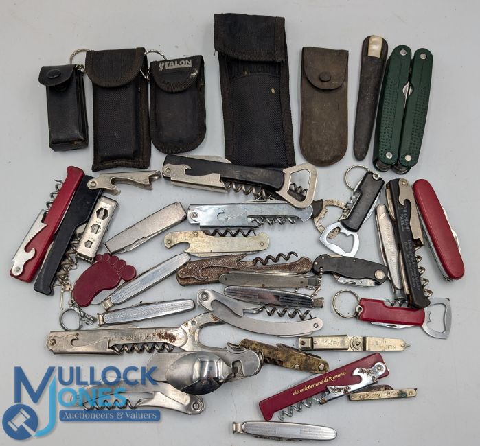 Collection of corkscrews, bottle openers, multi tools, pipe Reamers clean tools, new and old, to include Talon set, Champagne Mercier, Klip Klip Co tool (#33)