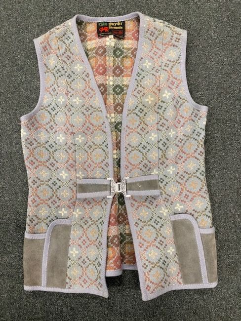Collection of Welsh Tapestry Period Clothes: with good examples of Welsh tapestry Celtique 40” chest, real Welsh tapestry skirt 42, Gwydir garments waistcoat 16, Martinique Donegal handwoven tweed skirt 26”, a Rogant Scottish tweed two piece shirt and jacket, pink tweed skirt 32”, a vintage poncho plus an Austrian Haller textile – fabric tablecloth (1 box)