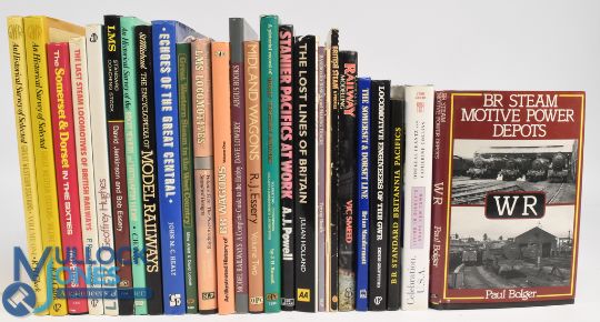 Twenty-Six mainly Railway & Railway Modelling Books – BR Steam Motive Power Depots 1983 Paul Bolger, Celebration USA 1999 Douglas Frantz and Catherine Collins, BR Standard Britannia Pacifics 1975 G Weekes, Locomotive Engineers of the GWR 1988 Denis Griffiths, Modellers & Enthusiasts Guide to The Somerset & Dorset Line 1982 Brain Macdermott, Complete Railway Modelling 1982 Vic Smeed, British Steam A Profile 1976 Patrick Whitehouse, Light Railway Layout Designs 1991 Iain Rice, Baseboard Basics and Making Tracks 1993 Trevor Booth, The Lost Lines of Britain 2010 Julian Holland, Stanier Pacifics at Work 1986 A J Powell, A Pictorial Record of Great Western Engines 1988 J H Russell, An Illustrated History of Midland Wagons 1984 R J Essery, Model Railways 1992 Dave Lowery, An Illustrated History of BR Wagons 1985 P Bartlett, An Illustrated History of LMS Locomotives 1989 Bob Essery and David Jenkinson, Great Western Steam in the West Country 1991 Mike Arlett and David Lockett, Echoes of the Great Central 1996 John Healy, The Encyclopaedia of Model Railways 1982 Terry Allen, An Historical Survey of the Didcot, Newbury and Southampton Railway 1984 C W Judge, An Illustrated History of LMS Standard Coaching Stock 1991 David Jenkinson and Bob Essery, LNER 1987 Geoffrey Hughes, The Last Steam Locomotives of British Railways 1987 P Ramsome-Wallis, The Somerset & Dorset in the Sixties Part 3 19900 Ivo Peters, An Illustrated Survey of Selected Great Western Stations 1987 Volume 1 & 3 R H Clark, majority in good condition