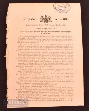 Phonograph (early gramophone) Patent Document, 1899 - Patent for invention for playing up to 4-cylinder records one after the other. Interesting development some 40 years before record changers came into the home. A 5-page patent with detailing text and these two illustrations. Size folded 7" x 10"