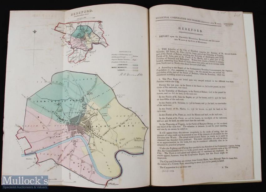 Hereford Municipal Boundary 1831: Report on the Proposed Municipal Boundary and Division of Wards in the City. 4pp folio with hand coloured map and plan of the city, in modern binding