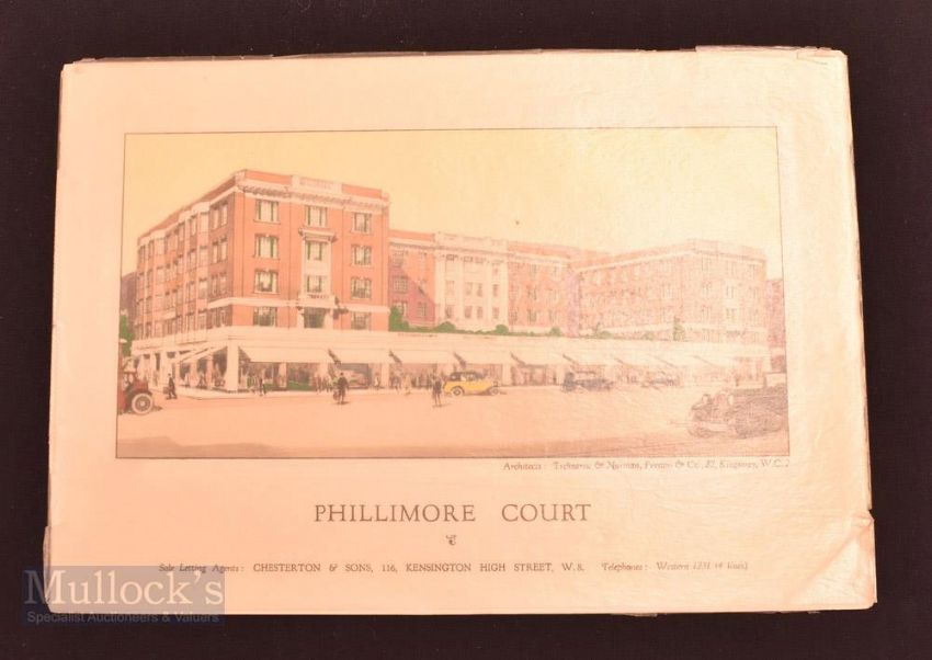 Luxury development in Kensington High Street "Phillimore Court", 1930s quality publicity brochure of this attractive Art Deco development of shops and luxury flats with 3 illustrations, and full-page plan of the flats with details and rentals ranging from £185 to £400, plus pictorial map of the street. Attractively printed on quality art paper in fine card cover size 10½" x 7¼"