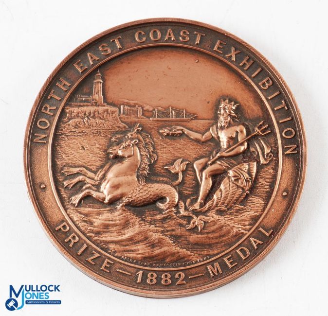North East Coast Exhibition Prize Medal 1882 - Vignette of Neptune with Lighthouse in background. Copper Prize Medal size 50mm (was meant to be affixed to a Traction Engine or machinery which won this prize)