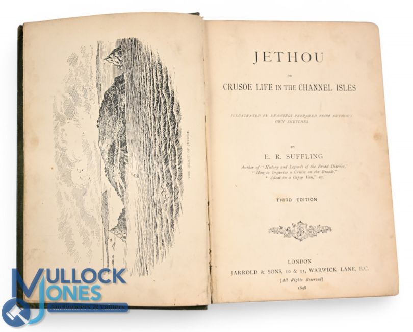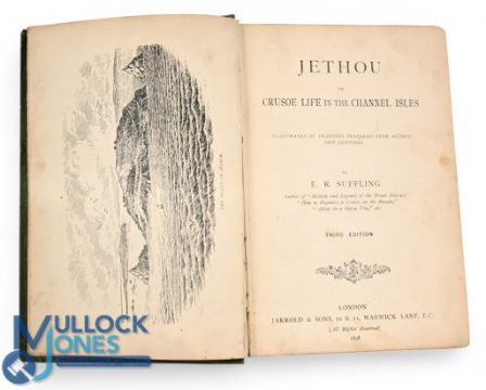 Jethou or Crusoe Life in The Channel Isles by E R Suffling 1898. An interesting 276 page book with over 20 illustrations from drawings by the author. Being accounts of life in isolation on a small island in the Channel Islands until rescuing his Man Friday etc. Cloth bound book, size 5¼" x 7¼". (Prize book plate to inside cover heavy wear to covers)