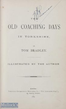 The Old Coaching Days in Yorkshire by Tom Bradley 1889 first edition - 251 page book with 91 illustrations of Coaching Inns and Stagecoaches within the text all actually drawn by the author. Quite extensively telling of the Coaching Age some 50 years earlier, the various Inns, the coaches, anecdotes regarding characters involved etc. In pictorial gilt cloth, black titles, size 6" x 8½"