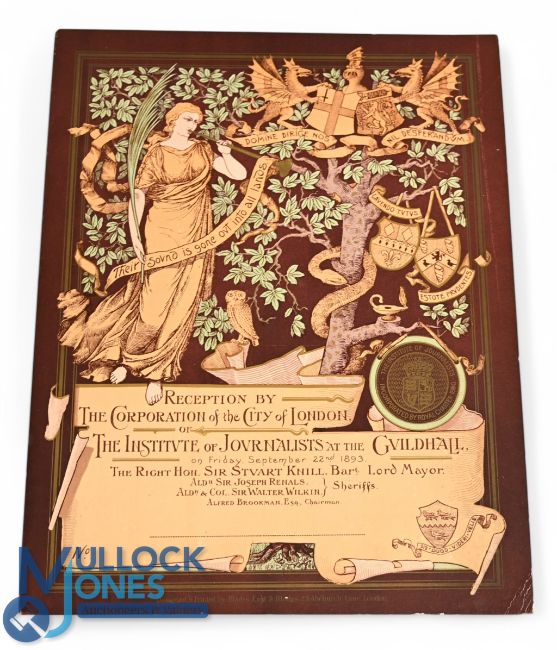 Guildhall, City of London Invitation 1893. A very attractive Arts & Craft style invitation to attend this Institute of Journalists event at the Guildhall. Multicoloured cromo-litho printing on card, size 11½" x 8½"
