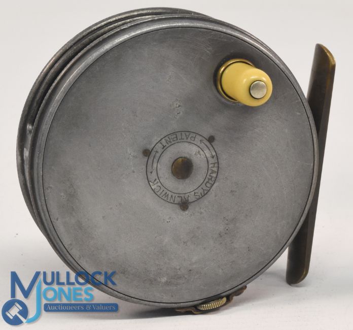 Hardy Bros "Perfect" alloy trout fly reel, 3 3/8" ventilated polished spool, xylonite handle, 1912 check, strapped milled rim tensioner, smooth 4 screw foot, constant check, runs very well