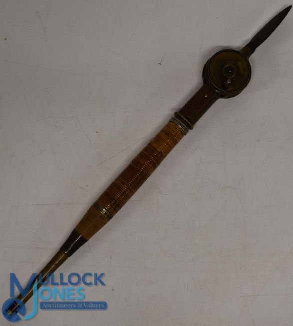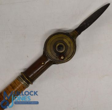 Rare unnamed Ryder Patent Linear brass reel, 2" diameter plate wind, turned bone handle, skeleton backplate, constant check clicker, spring push button on the reel ferrule releases it from the rattan handle, and an early steel screw in butt spear attached to reel base, incredibly rare early reel