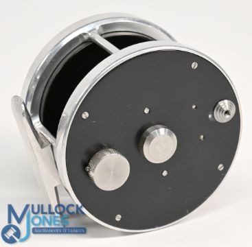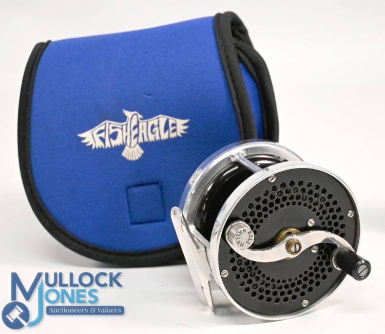 Bill Ballen alloy winch fly reel 3 ¼" perforated wide spool, counter balanced handle on serpentine arm, milled tensioner, light use. In Fish Eagle Neoprene case. Runs well