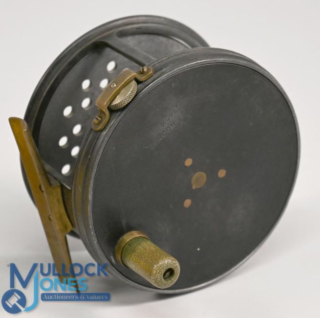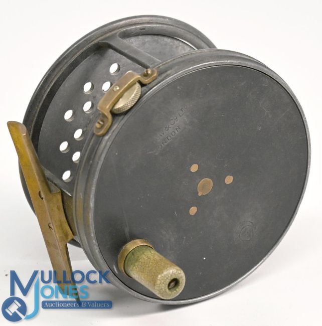 C Farlow & Co Ltd London Perfect style alloy fly reel, 3 ½" perforated wide spool, Xylonite handle, strapped milled rim tensioner, constant check, smooth brass foot. Good finish, runs well