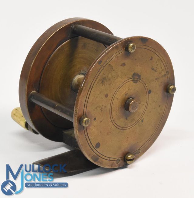 Early 3" brass Scottish pattern fishing reel, crank winch, bone handle, constant check, a bit lumpy