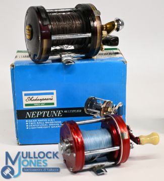 Abu Sweden Ambassadeur 6000 Multiplier side tensioner, good free spool, counter balanced handle. Runs well in zip case. Shakespeare Neptune Multiplier, on/off check, counter balanced handle, light use, in box with instructions. (2)