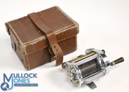 Hardy Bros "The Elarex" alloy bait casting reel, twin tapered handles, side tensioner, on/off check, ribbed foot. Light use, in Rexine box with wrap over strap, runs well