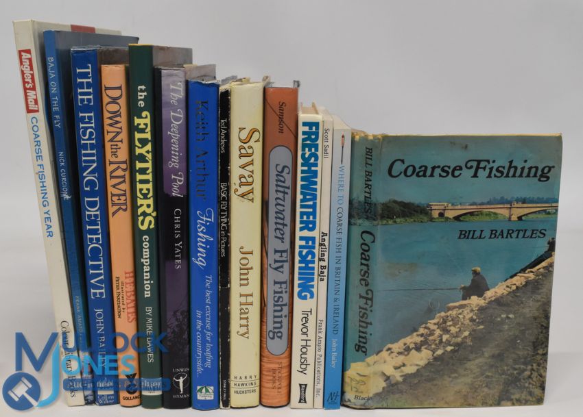 Fourteen Fishing Books to include Coarse Fishing 1973 Bill Bartles, Where to coarse Fish in Britain & Ireland 2008 John Bailey, Angling Baja 1996 Scott Sadil, Fresh-Water Fishing 1983 Trevor Housby, Saltwater Fly Fishing 1991 Jack Samson, Savay 1992 John Harry (signed), Basic Flytying in Pictures 1988 Ted Andrews, Keith Arthur Fishing 2009, The Deepening Pool 1990 Chris Yates, The Flytier's Companion 1993 Mike Dawes, Down the River 1987 H.E Bates, The Fishing Detective 1994 John Bailey, Baja on the Fly 1997 Nick Curcione, Angler's Mail Coarse Fishing Year 1990, good condition with some small wear/tear to dust jackets, marks, additional writing