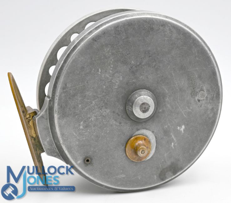 Allcock's Aerial 4 ½" double ventilated centre pin reel with large and small perforations to both flanges, stamped 2384 internally, six spoke, twin handle, maker's details to rear, on/off check, quick release spool, spins very well with minimal wobble