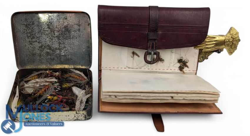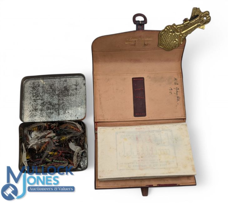 Fine C Farlow & Co Ltd, 10 Charles Street, London, leather fly wallet, dated 1915, parchment pockets holding good selection of trout fly sprays to gut, and a quantity of early gut eyed salmon flies, various sizes up to 5/0. (Qty)